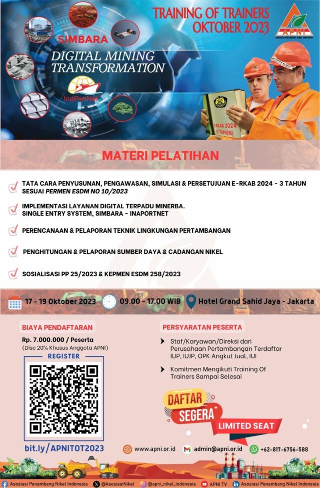 NIKEL.CO.ID, 25 SEPTEMBER 2023 – Kegiatan Training of Trainers yang akan diadakan oleh Asosiasi Penambang Nikel Indonesia (APNI) kali ini mengambil tema “Sistem Digitalisasi Pertambangan, Teknis E-RKAB 3 Tahun, Eksplorasi, Teknik Lingkungan dan Sosialisasi PP (Peraturan Pemerintah) dan Kepmen (Keputusan Menteri)”.