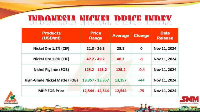 Ini adalah perubahan yang signifikan mengingat pada minggu sebelumnya, 4 November 2024, harga MHP justru mengalami kenaikan di tengah penurunan harga komoditas nikel lainnya. Tren penurunan harga sebagian besar produk nikel ini berlanjut pada minggu ini, meskipun high-grade nickel matte mengalami lonjakan harga yang cukup besar.