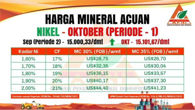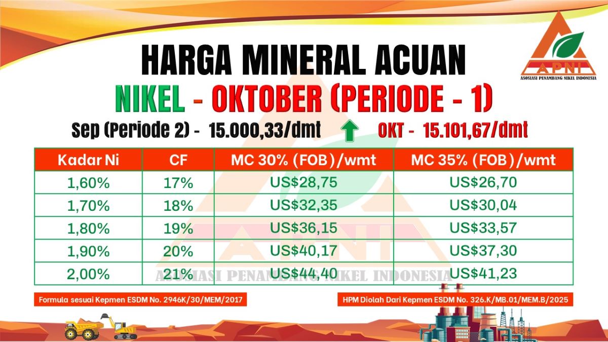 Hal itu terlihat dari rilis yang dikeluarkan Asosiasi Penambang Nikel Indonesia (APNI) yang menyoroti kenaikan harga mineral acuan (HMA) komoditas nikel periode pertama Oktober 2025 sesuai Kepmen ESDM No. 326.K/MB.01/MEM.B/2025 dan dihitung berdasarkan formula yang mengacu pada Kepmen ESDM No. 2946K/30/MEM/2017, yang mempertimbangkan kadar nikel, moisture content (MC), dan free on board (FOB).