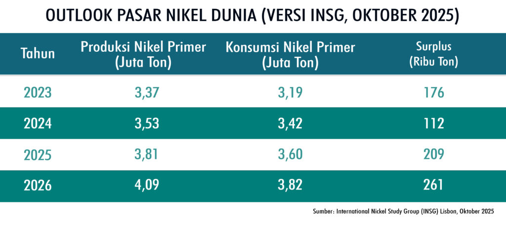 Produksi nikel primer dunia diperkirakan naik dari 3,53 juta ton (2024) menjadi 3,81 juta ton (2025) dan 4,08 juta ton (2026), sedangkan konsumsi nikel global juga meningkat dari 3,42 juta ton (2024) menjadi 3,82 juta ton (2026). Dengan demikian, pasar nikel dunia masih mencatat surplus moderat sebesar 209 ribu ton pada 2025 dan 261 ribu ton pada 2026.