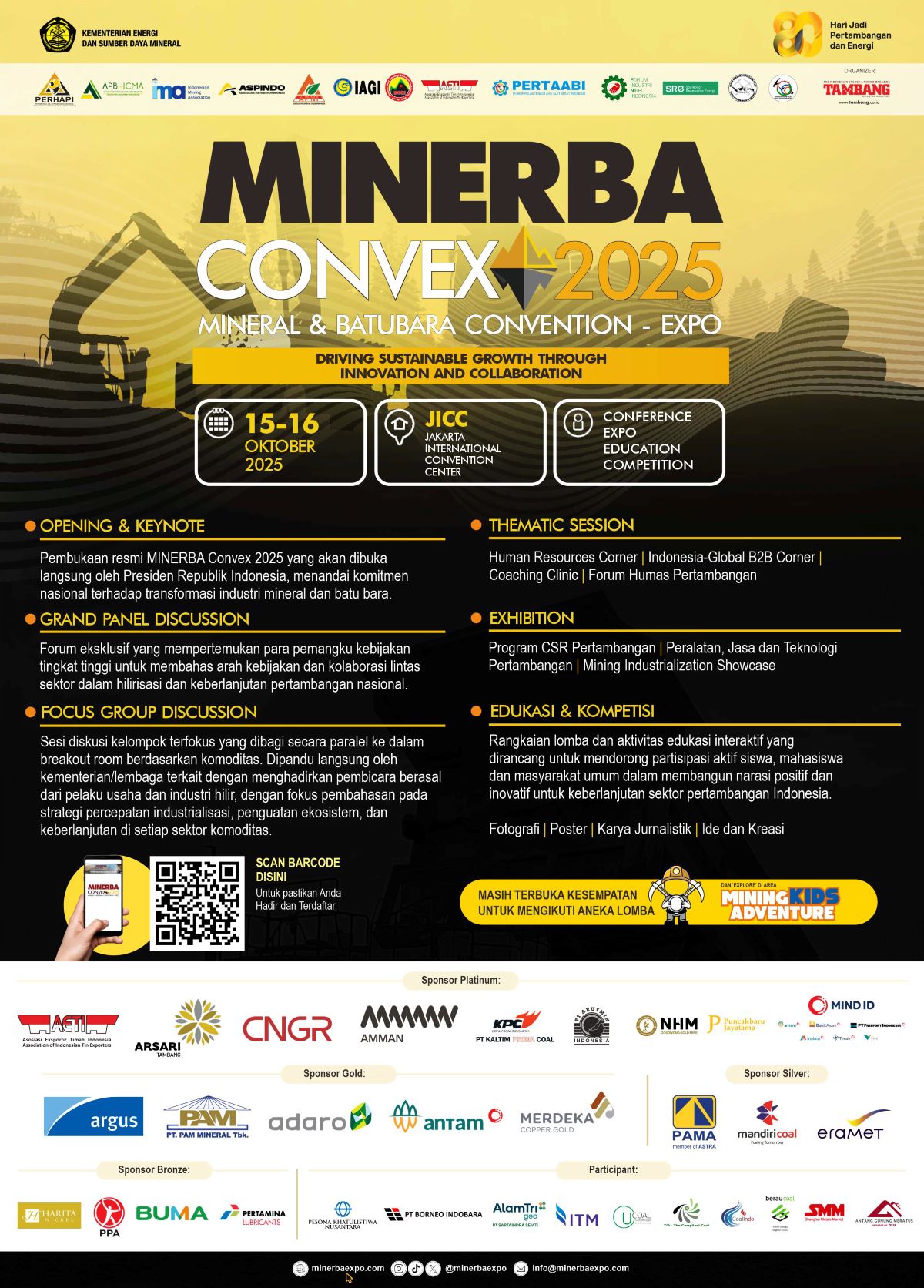 Minerba Convex 2025 kali ini mengusung tema “Driving Sustainable Growth: Through Innovation and Collaboration”. Tahun ini Kementerian Energi dan Sumber Daya Mineral (ESDM) melibatkan 11 asosiasi dalam sektor pertambangan untuk mensukseskan acara tersebut.