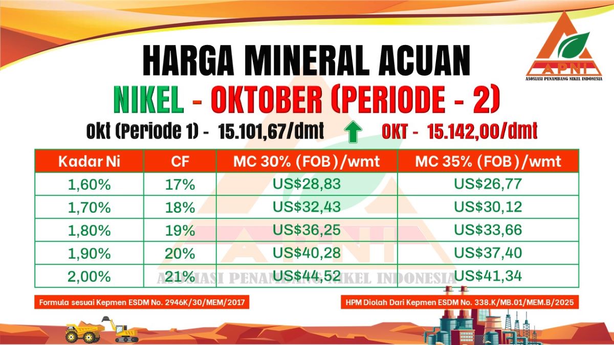 Berdasarkan rilis resmi yang diterbitkan APNI, HPM nikel untuk periode kedua Oktober 2025 ditetapkan sebesar US$15.142,00 per dmt (dry metric ton). Angka ini mengalami sedikit kenaikan dari harga pada periode pertama Oktober, yang sebelumnya berada di angka US$15.101,67 per dmt.