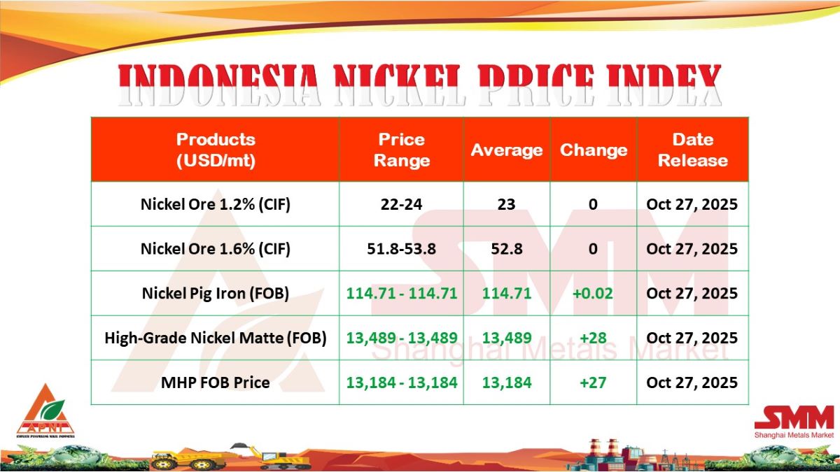 Berdasarkan data resmi APNI, harga bijih nikel kadar 1,2% (CIF) tercatat di kisaran US$22–24 per metrik ton dengan rata-rata US$23 per metrik ton, tanpa perubahan dibanding periode sebelumnya. Sementara itu, bijih nikel kadar 1,6% (CIF) berada pada rentang US$51,8–53,8 per metrik ton dengan rata-rata US$52,8 per metrik ton, juga tidak mengalami perubahan harga.