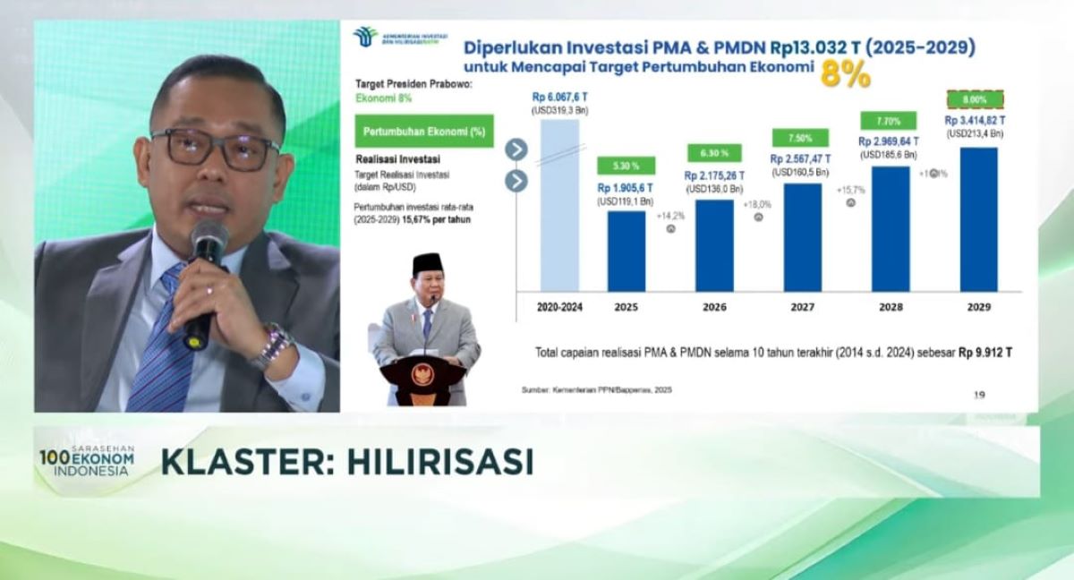 “Selama dua periode pemerintahan terakhir, realisasi investasi mencapai Rp9.200 triliun. Untuk mencapai target pertumbuhan 8 persen, kami ditugaskan merealisasikan investasi sebesar Rp13.000 triliun dalam lima tahun ke depan,” paparnya.