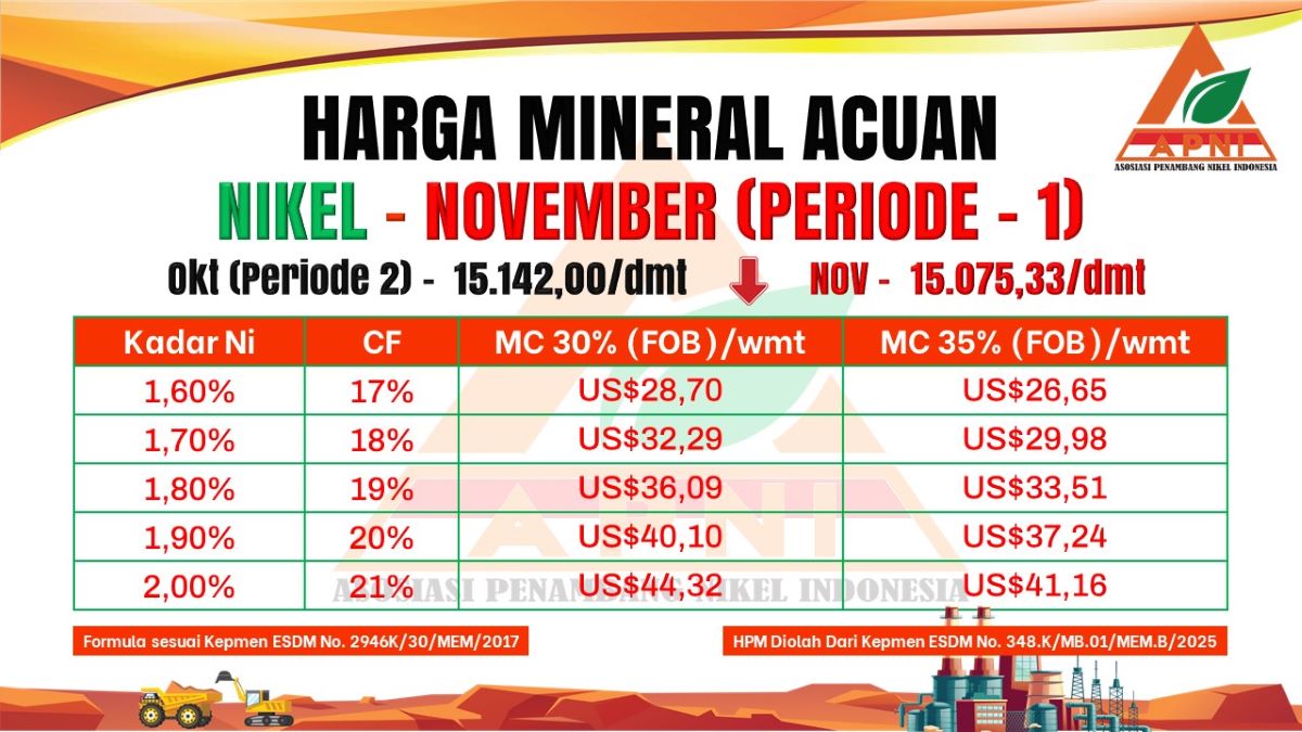 NIKEL.CO.ID, JAKARTA — Bersamaan air hujan yang turun setiap sore di Jakarta, Harga Patokan Mineral (HPM) Nikel periode I November 2025 yang dirilis Asosiasi Penambang Nikel Indonesia (APNI) juga turun menjadi US$15.075,33. Sebelumnya, periode II Oktober 2025 harganya US$15.142,00/dmt.