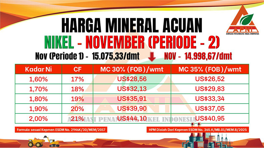 Menurut data APNI, harga nikel November periode II 2025 tercatat US$14.998,67 per dmt, turun dibanding periode I yang berada di level US$15.075,33 per dmt atau turun sekitar US$76,66. Harga ini menjadi acuan utama transaksi nikel di Indonesia, khususnya dalam perdagangan bijih nikel dengan kadar air atau moisture content (MC) 30–35% dengan basis free on board (FOB).