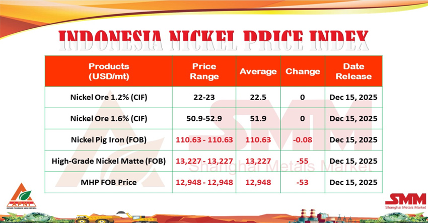NIKEL.CO.ID, JAKARTA — Asosiasi Penambang Nikel Indonesia (APNI) merilis pembaruan harga komoditas nikel Indonesia per 15 Desember 2025. Rilis ini menunjukkan kecenderungan harga yang relatif stabil pada sejumlah produk utama nikel di tengah dinamika permintaan global dan tekanan harga dari pasar internasional.