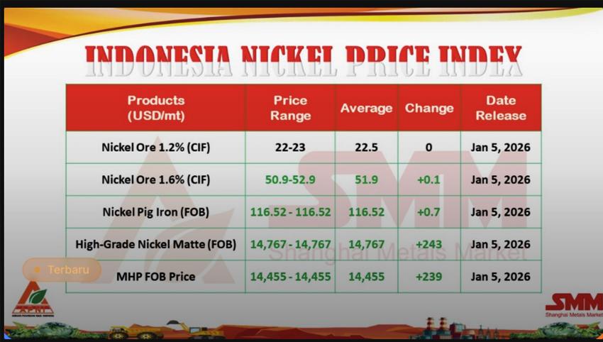 NIKEL.CO.ID, JAKARTA — Asosiasi Penambang Nikel Indonesia (APNI) kembali merilis Indonesia Nickel Price Index (INPI) hari ini, 5 Januari 2026. Data terbaru menunjukkan tren penguatan harga pada produk olahan nikel, sementara harga bijih nikel relatif stabil dibandingkan rilis sebelumnya pada 29 Desember 2025.