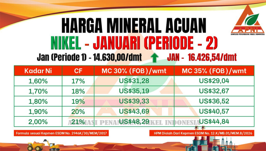 Berdasarkan data KESDM yang diolah APNI, HMA Nikel Periode ke-2 Januari 2026 ditetapkan sebesar US$16.426,54/dmt, naik signifikan, yakni US$1.796,54, dari periode 1 Januari 2026 yang berada di level US$14.630,00/dmt. Penguatan ini mencerminkan tren kenaikan harga nikel global yang turut mempengaruhi nilai jual bijih nikel (nickel ore) di dalam negeri.