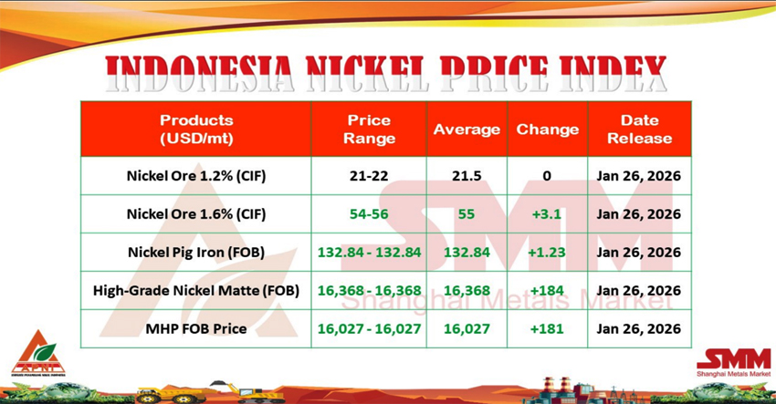NIKEL.CO.ID, JAKARTA — Angin segar dan menggembirakan berhembus saat Asosiasi Penambang Nikel Indonesia (APNI) merilis Indeks Harga Nikel Indonesia atau Indonesia Nickel Price Index (INPI), Senin, 26 Januari 2026, kemarin. Dua produk, high-grade nickel matte dan mixed hydroxide precipitate (MHP), naik tajam. Produk lainnya tampak tren penguatan.