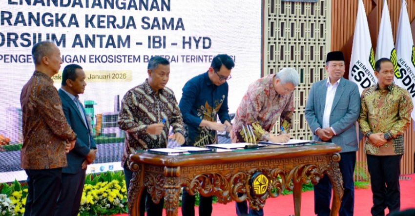 NIKEL.CO.ID, JAKARTA — Pemerintah terus mempercepat pengembangan ekosistem baterai kendaraan listrik (electric vehicle/EV) terintegrasi di Indonesia melalui penandatanganan kerangka kerja sama konsorsium PT Antam Tbk. – Indonesia Battery Industry (IBI) – HYD. Penandatanganan tersebut disaksikan langsung oleh Menteri Energi dan Sumber Daya Mineral (ESDM), Bahlil Lahadalia, di Gedung Aula Sarulla, Kementerian ESDM, Jakarta, Jumat (30/1/2026).