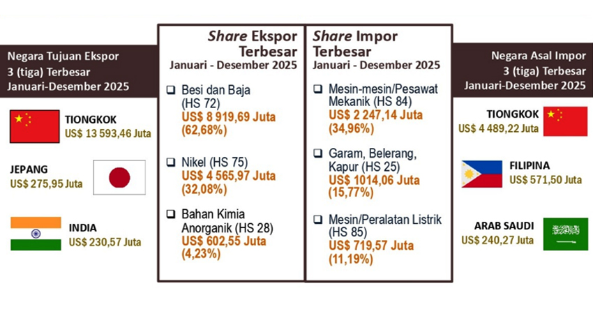 Hal itu diungkapkan Statistisi Ahli Madya BPS Provinsi Maluku Utara, Evida Karismawati. Komoditas besi dan baja, katanya melanjutkan, menjadi penyumbang utama pertumbuhan ekspor selama 2025 dengan kenaikan sebesar US$2.268,28 juta. Komoditas logam dasar lainnya mengalami kenaikan persentase tertinggi mencapai 510,07%.