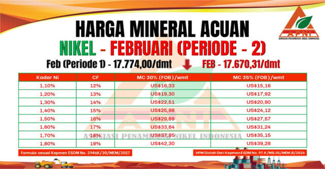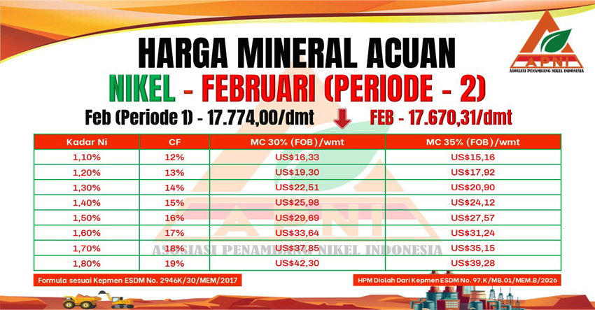 Berdasarkan Kepmen tersebut dan formulasi yang tercantum dalam Kepmen ESDM No. 2946K/30/MEM/2017, Asosiasi Penambang Nikel Indonesia (APNI) secara resmi merilis Harga Patokan Mineral (HPM) Nikel periode kedua 2026. Dalam rilis tersebut, harga nikel tercatat turun dibanding periode pertama Februari ini.