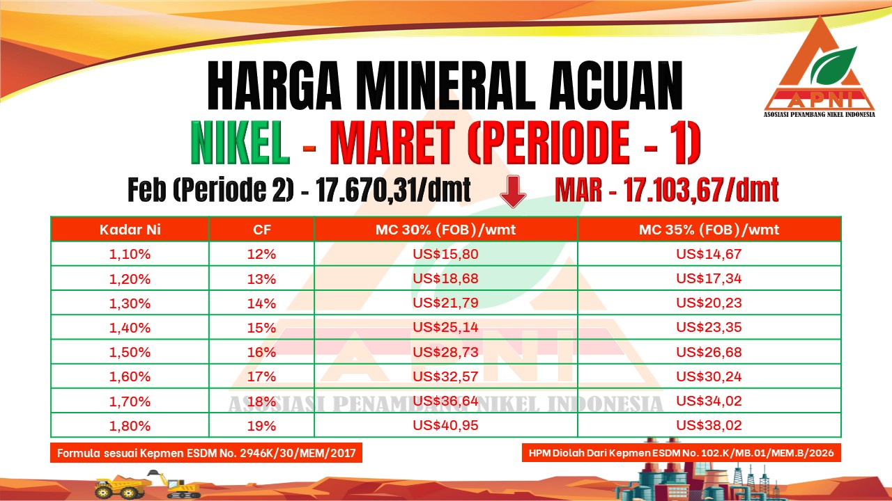 NIKEL.CO.ID, JAKARTA — Harga Mineral Acuan (HMA) nikel periode I Maret ditetapkan sebesar US$17.103,67/dmt, turun dibandingkan periode II Februari yang tercatat sebesar US$17.670,31/dmt. Penetapan HMA ini mengacu pada Kementerian Energi dan Sumber Daya Mineral (ESDM) melalui ketentuan dalam Kepmen ESDM No. 2946K/30/MEM/2017 serta Kepmen ESDM No. 102.K/MB.01/MEM.B/2026.