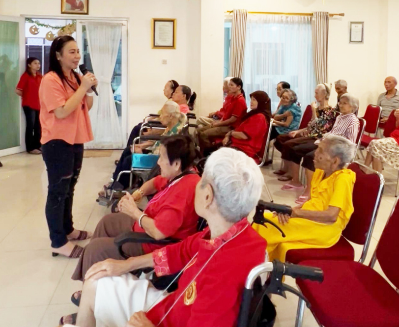 Tak lama kemudian, para penghuni panti dikumpulkan dalam satu ruangan untuk mengikuti rangkaian acara bersama. Suasana ruangan terasa hangat dan penuh antusiasme. Para oma dan opa duduk berdekatan, sebagian di kursi roda, sebagian lainnya saling bersandar sambil berbincang pelan. Kehadiran para tamu membuat ruangan yang sederhana itu dipenuhi energi kebahagiaan.