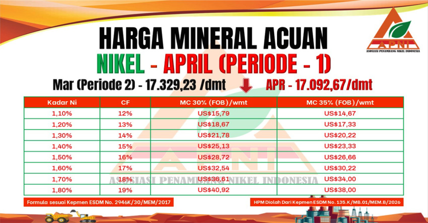 NIKEL.CO.ID, JAKARTA — Harga Mineral Acuan (HMA) Nikel untuk April 2026 Periode 1 yang dirilis Kementerian Energi dan Sumber Daya Mineral (ESDM) tercatat US$17.092,67/dmt, turun US$236,56 dari HMA Maret Periode 2 pada level US$17.329,23/dmt.