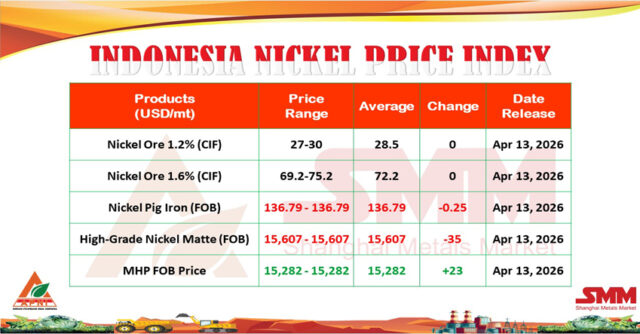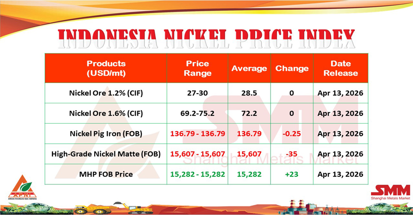 NIKEL.CO.ID, JAKARTA – Indonesia Nickel Price Index (INPI) yang dirilis Asosiasi Penambang Nikel Indonesia bersama Shanghai Metals Market (SMM) pada 13 April 2026 menunjukkan pergerakan yang beragam dibandingkan rilis sebelumnya pada 6 April 2026.